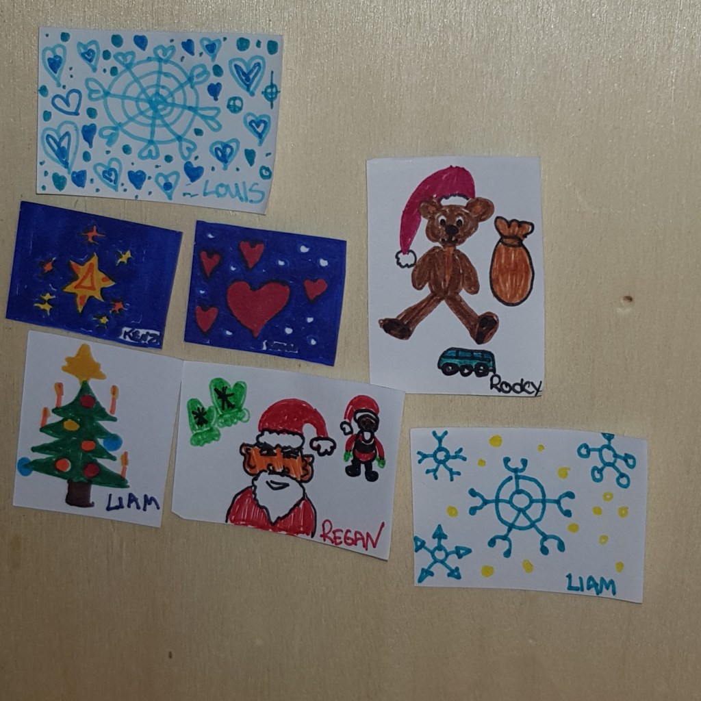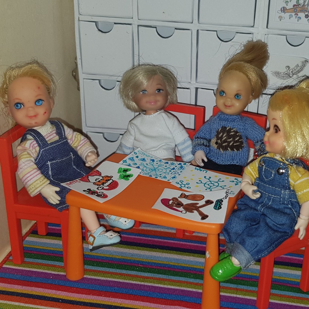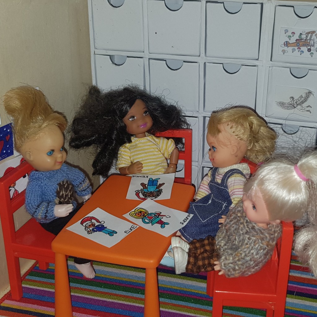 Afterwards they made new drawings. Kenzie suggested self portraits, and the others loved her idea. But suddenly Liam’s drawing was gone – must be the elf again.